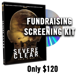 FUNDRAISING SCREENING KIT. Includes 1 Limited Public Performance Licensed DVD, 10 DVDs, 5 posters, 100 postcards and a discussion guide. The kit “pays for itself” because it includes enough extra DVDs to sell at the event to cover the cost of the kit, and helps you raise additional funds for your organization! We encourage veterans organizations, community groups, grassroots groups and individuals across to organize screenings, houseparties and actions around SEVERE CLEAR in an effort to support the sacrifices of our troops and issues such as post traumatic stress disorder (PTSD).